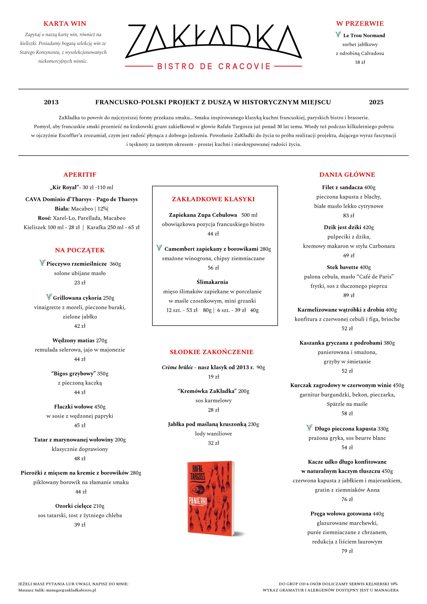 ZaKładka to powrót do najbardziej czystej formy przekazu smaku, inspirowanego klasyką kuchni francuskiej, paryskich bistro i brasserie. Pomysł, aby francuskie smaki przenieść na grunt krakowski zakiełkował w głowie Rafała Targosza już ponad 25 lat temu, kiedy to podczas kilkuletniego pobytu w ojczyźnie Escoffier’a zrozumiał, czym jest radość płynąca z dobrego jedzenia. Powołanie ZaKładki do życia to próba realizacji projektu, dającego wyraz fascynacji i tęsknoty za tamtym okresem czasu – prostej kuchni i nieskrępowanej radości życia.